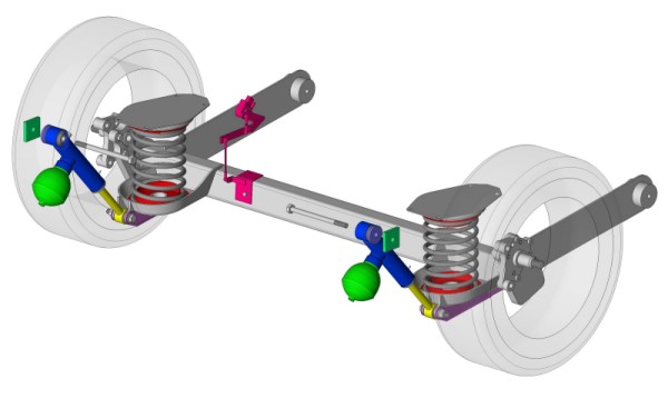 ¤ Unité arrière montée sur articulations élastiques assurant le filtrage des bruits de roulement ainsi qu'un guidage optimal de l'essieu arrière.